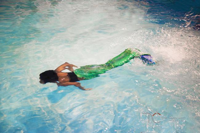 She is a theatre student at Collin College with an emphasis on performance. Her skills include bubble shapes, flips, twists, underwater modeling, mermaid rides for children under 80 pounds, and mermaid games for swimmers of all ages.
